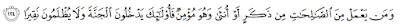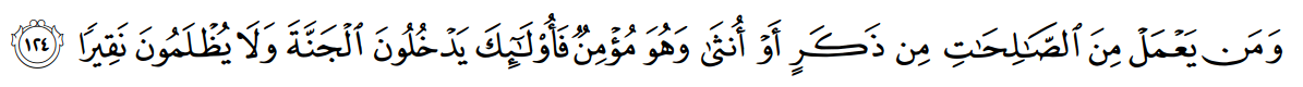 Barang siapa yang mengerjakan amal-amal saleh, baik laki-laki maupun wanita sedang ia orang yang beriman, maka mereka itu masuk ke dalam surga dan mereka tidak dianiaya walau sedikit pun.