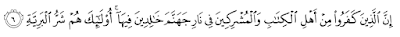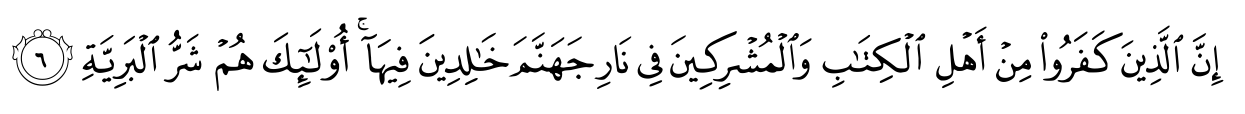 "Sesungguhnya orang-orang kafir yakni ahli Kitab dan orang-orang musyrik (akan masuk) ke neraka Jahanam; mereka kekal di dalamnya. Mereka itu adalah seburuk-buruk makhluk."[6].